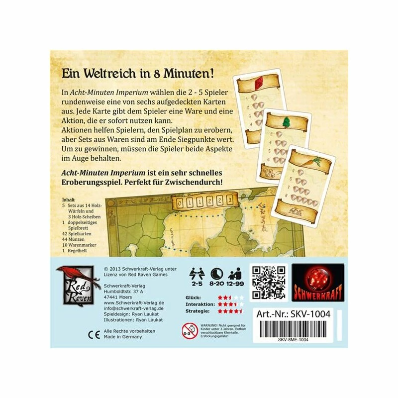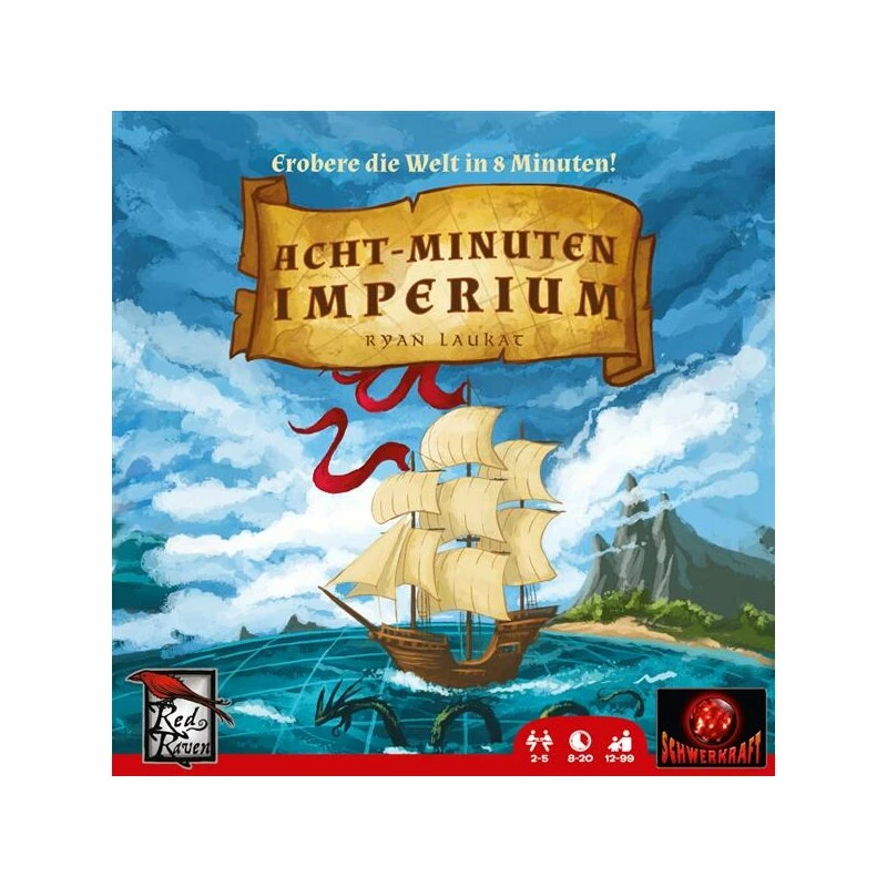 Acht-Minuten Imperium ist das kürzeste Eroberungs- und Entwicklungs-Spiel, welches Du je gespielt hast. Es ist in nur 1 Minute aufgebaut und dauert nicht länger als 20 Minuten. Noch nie hat jemand so schnell die Welt erobert!