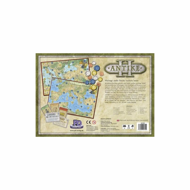 Antike II ist eine Fortentwicklung des 2005 erschienenen Antike mit neuen Spielplänen, geänderten Fortschritten und etwas anderen, aber noch einfacheren Regeln. Es ist ein spannender Wettstreit für 3 – 6 Spieler ab 12 Jahren. Mit zwei Szenarien – Mare Nostrum und Orient – wird antike Geschichte in ca. 90 – 120 min. wieder lebendig.