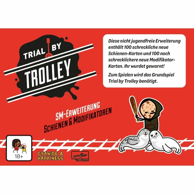 Die nicht jugendfreie SM-Erweiterung: Schienen & Modifikatoren für das Partyspiel Trial by Trolley enthält 100 schreckliche neue Schienen-Karten und 100 noch schrecklichere neue Modifikator-Karten. Dank besonders schlüpfriger Karten und noch schwärzerem Humor kommen alle Liebhaber von Zügen und moralischen Dilemmas voll auf ihre Kosten.