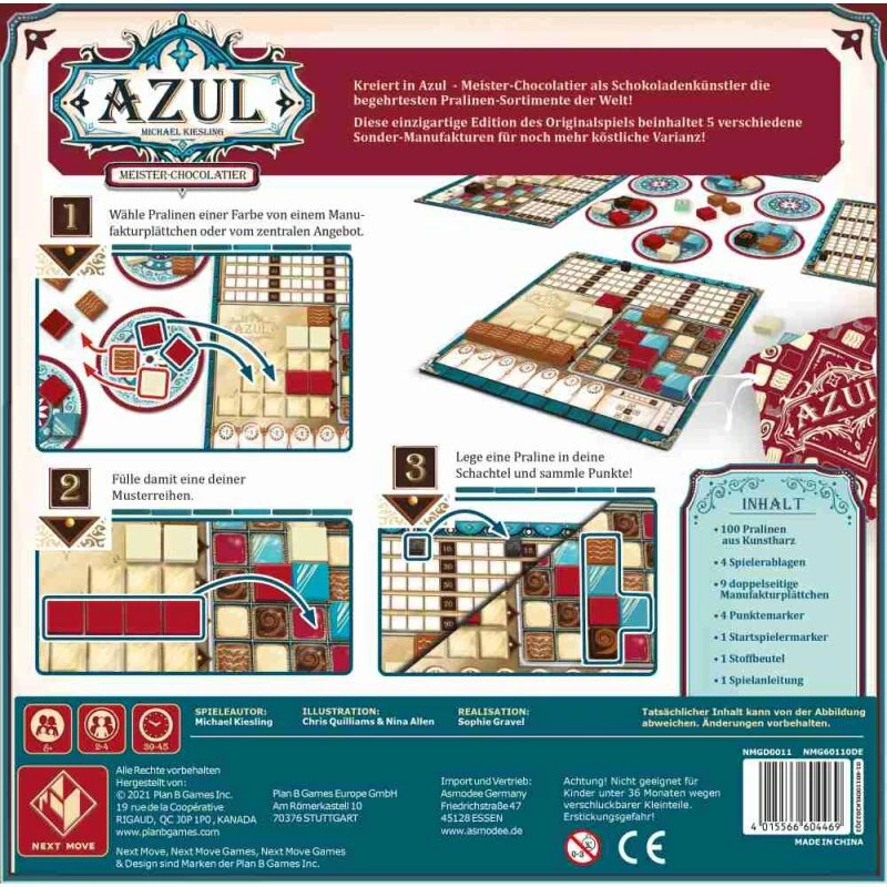 In Azul: Meister-Chocolatier kreieren die Spieler als Schokoladenkünstler die begehrtesten Pralinen-Sortimente der Welt. Die Spielregeln entsprechen denen des originalen Azul (Spiel des Jahres 2018), allerdings bringt die angepasste Optik mit Pralinen statt Fliesen das Herz eines jeden Schokoladen-Fans zum Schmelzen. Die Haptik des Spielmaterials bleibt dabei unverändert erstklassig.