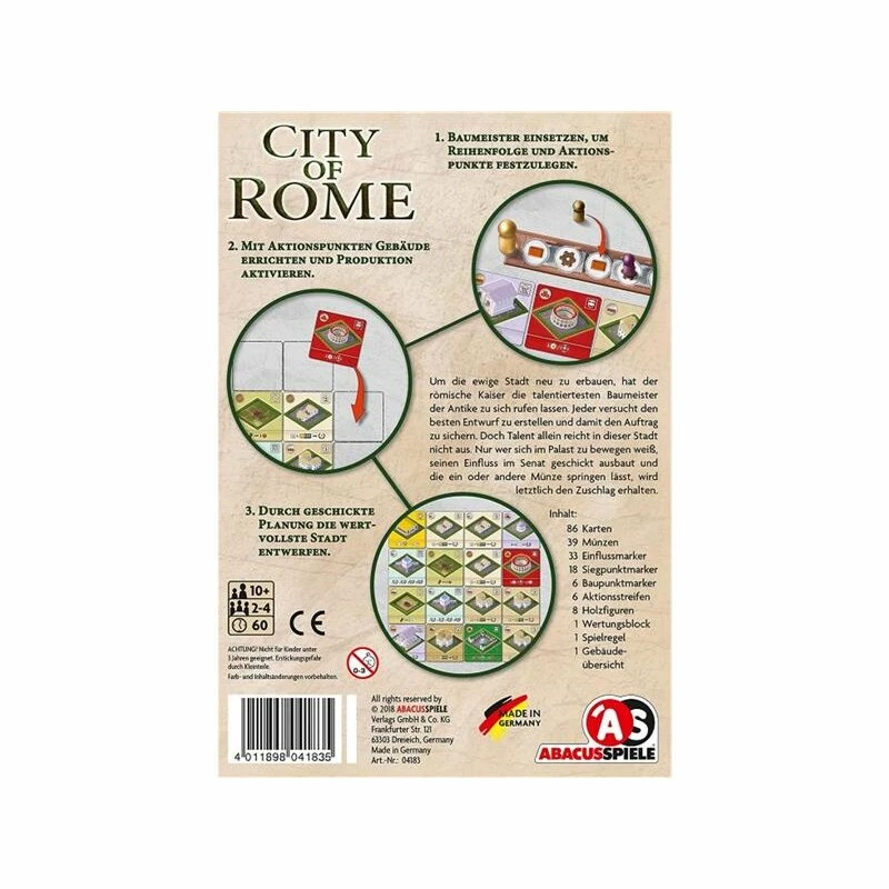 Um die ewige Stadt neu zu erbauen hat der römische Kaiser die talentiertesten Baumeister der Antike zu sich rufen lassen. Jeder versucht den besten Entwurf zu erstellen und damit den Auftrag zu sichern. Doch Talent allein reicht in City of Rome nicht aus. Nur wer sich im Palast zu bewegen weiß, seinen Einfluss im Senat geschickt ausbaut und die ein oder andere Münze springen lässt, wird letztlich den Zuschlag erhalten.