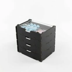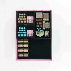 Das innovative Stecksystem in elegant-zeitlosem Schwarz kommt völlig ohne lästigen Leim, kompliziertes Schrauben oder müßiges Nageln aus. Es lässt sich ganz bequem zusammenstecken und passt präzise und zugleich optisch ansprechend in die Spielebox, sodass alle Bestandteile, ob Miniaturen, Plättchen, Würfel oder sogar gesleevte Karten, sicher verstaut und geschützt, transportiert und gelagert werden können.