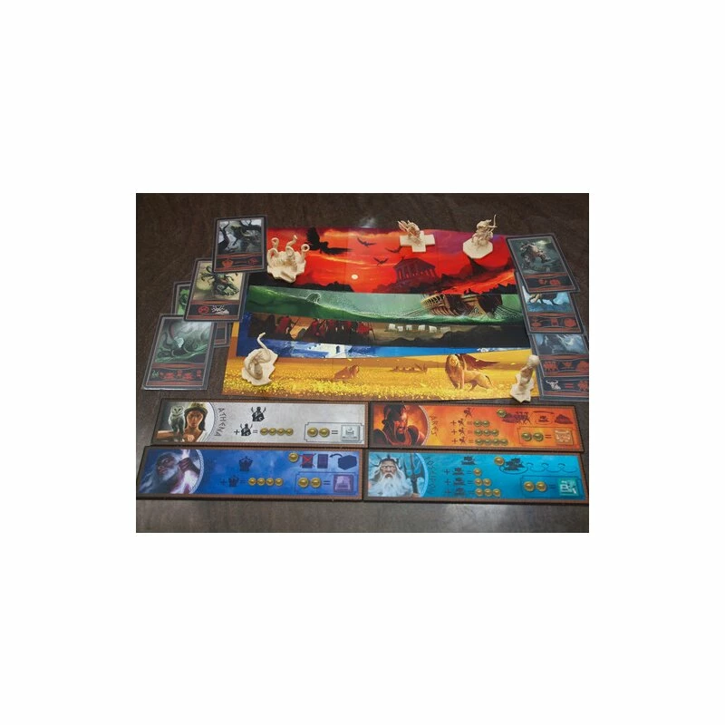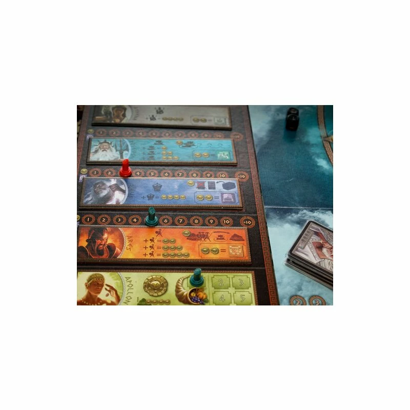 Victory requires respect for all the gods – players cannot afford to sacrifice to only one god, but must pay homage to each of five gods in turn. Each turn, the players bid for the favors of the gods, as only one player can have the favor of each god per turn – and each player is also limited to the favor of a single god per turn.