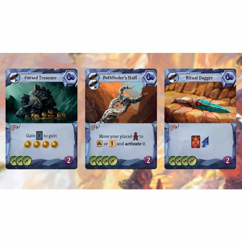 In addition to traditional deckbuilder effects, cards can also be used to place workers. New worker actions become available as players explore the island. Some actions require resources instead of workers — building a solid resource base will be essential. Limited to one action per turn, players must decide which action will benefit them the most. Decks are small, and randomness is heavily mitigated by the wealth of tactical decisions offered on the game board. With a variety of worker actions, artifacts, and equipment cards, the setup for each game will be unique, encouraging players to explore new strategies to meet the challenge.