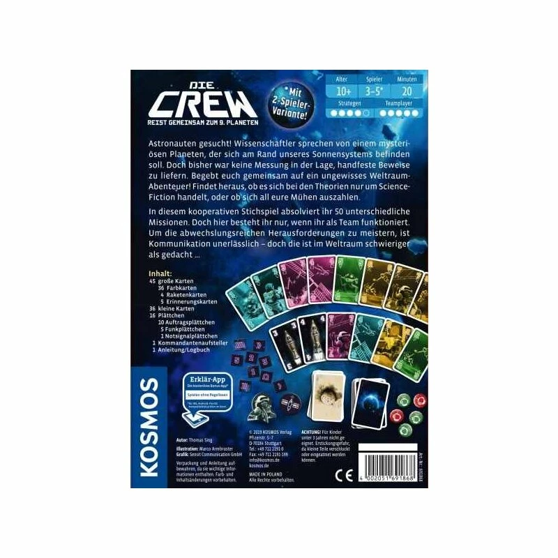 Im kooperativen Kartenspiel „Die Crew“ begeben sich die Spieler als Astronauten auf ein ungewisses Weltraum-Abenteuer. Was hat es mit den Gerüchten um den unbekannten Planeten auf sich? Ihre ereignisreiche Reise durchs All erstreckt sich über 50 spannende Missionen. Doch dieses Spiel kann nur bezwungen werden, indem gemeinsam die individuellen Aufgaben jedes Spielers erfüllt werden. Um die abwechslungsreichen Herausforderungen meistern zu können, ist Kommunikation im Team unerlässlich. Doch das ist im Weltraum schwieriger als gedacht.