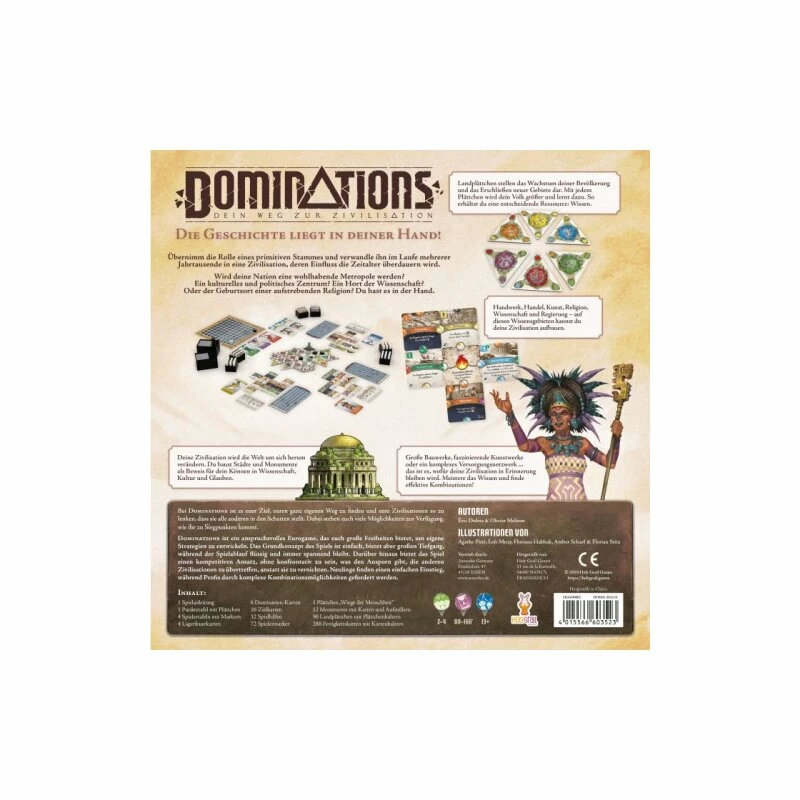 Im Zivilisations-Spiel Dominations übernimmt jeder Spieler die Rolle eines primitiven Stammes und verwandelt ihn in eine Nation, deren Einfluss die Zeitalter überdauern wird. Die Spieler vergrößern ihre Bevölkerung, indem sie dreieckige Landmassen platzieren und so Wissen sammeln, das darüber entscheidet, wie sich ihre Gesellschaft mit der Zeit entwickelt. Mit diesem neu errungenen Wissen können Städte gebaut und Fertigkeiten perfektioniert werden. Dominations ist ein anspruchsvolles Eurogame, das den Spielern große Freiheiten bietet, um eigene Strategien zu entwickeln.