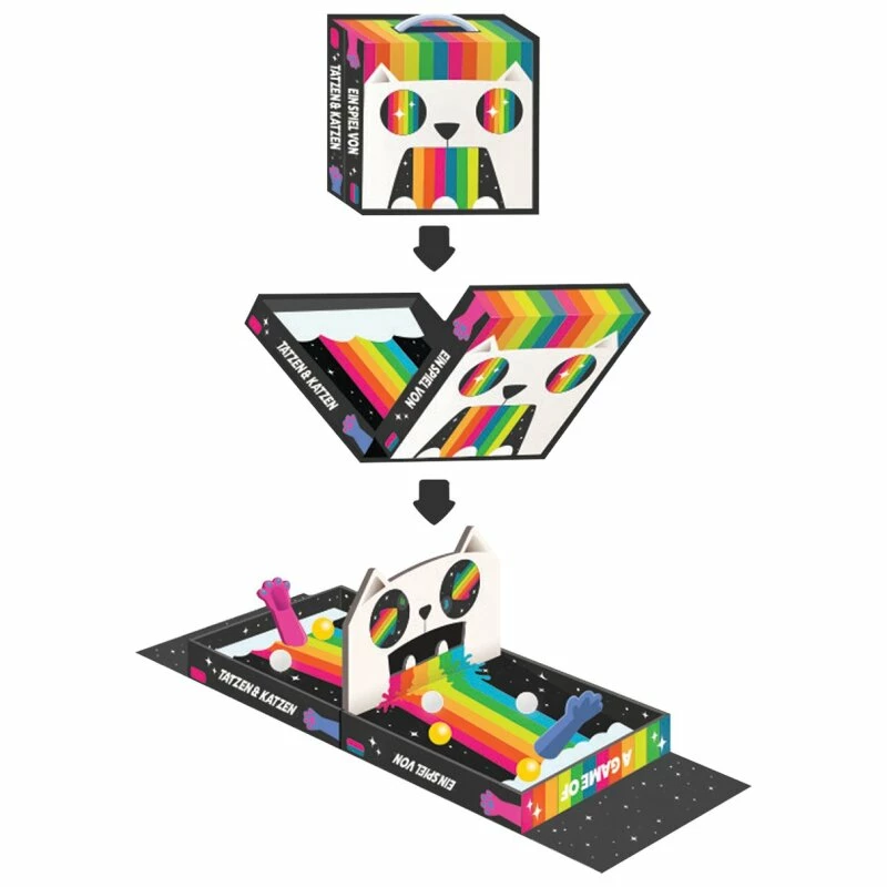 Ein Spiel von Tatzen & Katzen ist ein Geschicklichkeits- und Reaktionsspiel aus dem Hause Exploding Kittens, bei dem sich zwei Spieler vor einem Spielfeld gegenüberstehen. Mit Hilfe von Pfotenkatapulten müssen die farbigen Bälle auf die Seite des Gegners geschnippt werden. Um einen Punkt zu erzielen, müssen sich alle Bälle einer Farbe beim Gegner auf der anderen Seite des Spielplans befinden. Der Spieler, der es zuerst schafft, 5 Punkte zu erzielen, gewinnt das Spiel von Tatzen & Katzen.