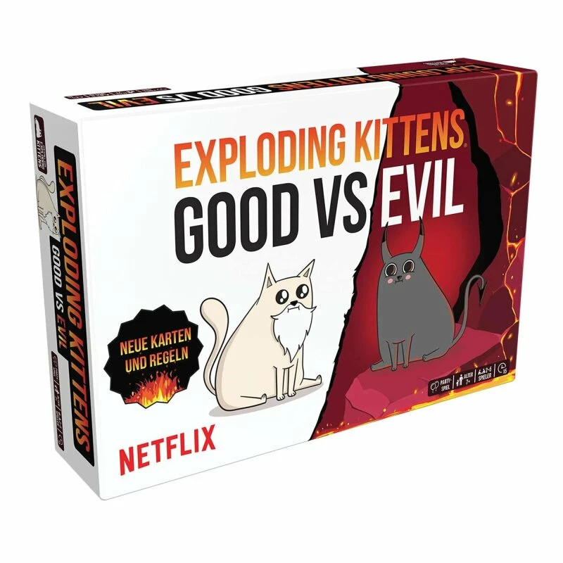 Die eigenständige Version Exploding Kittens: Good vs. Evil zur gleichnamigen Netflix-Animationsserie nimmt die Spieler mit in den ultimativen Wettstreit zwischen Gut und Böse – und explodierenden Kätzchen.