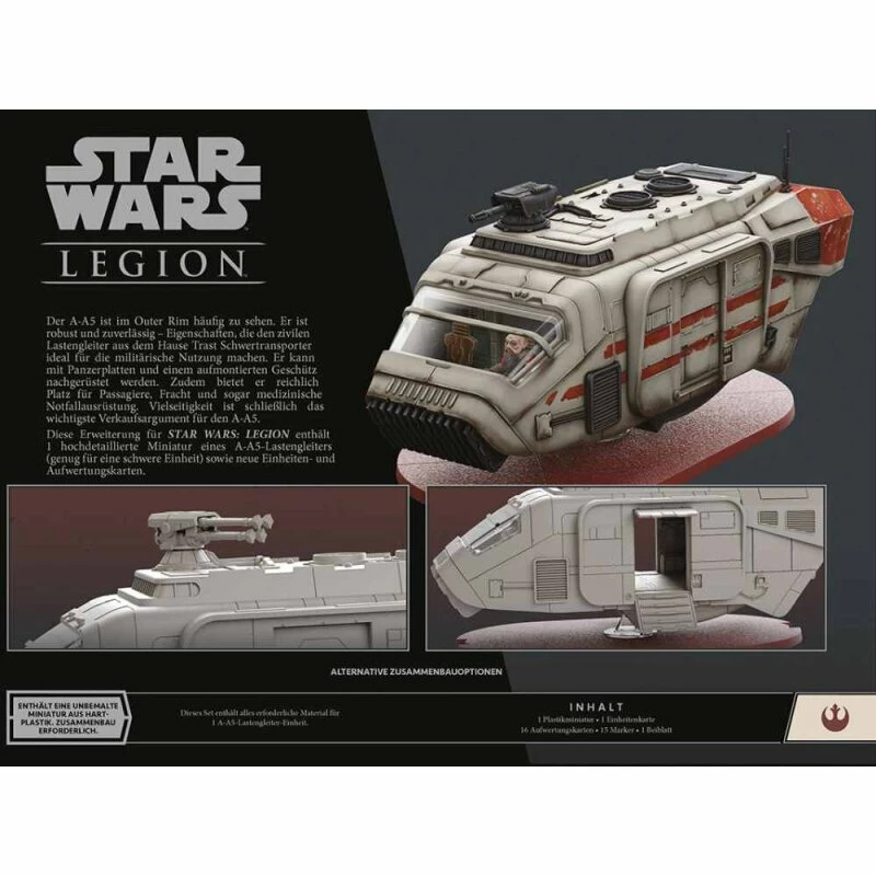 Diese Erweiterung für Star Wars: Legion enthält 1 hochdetaillierte Miniatur eines A-A5-Lastengleiters (genug für eine schwere Einheit) sowie neue Einheiten- und Aufwertungskarten.