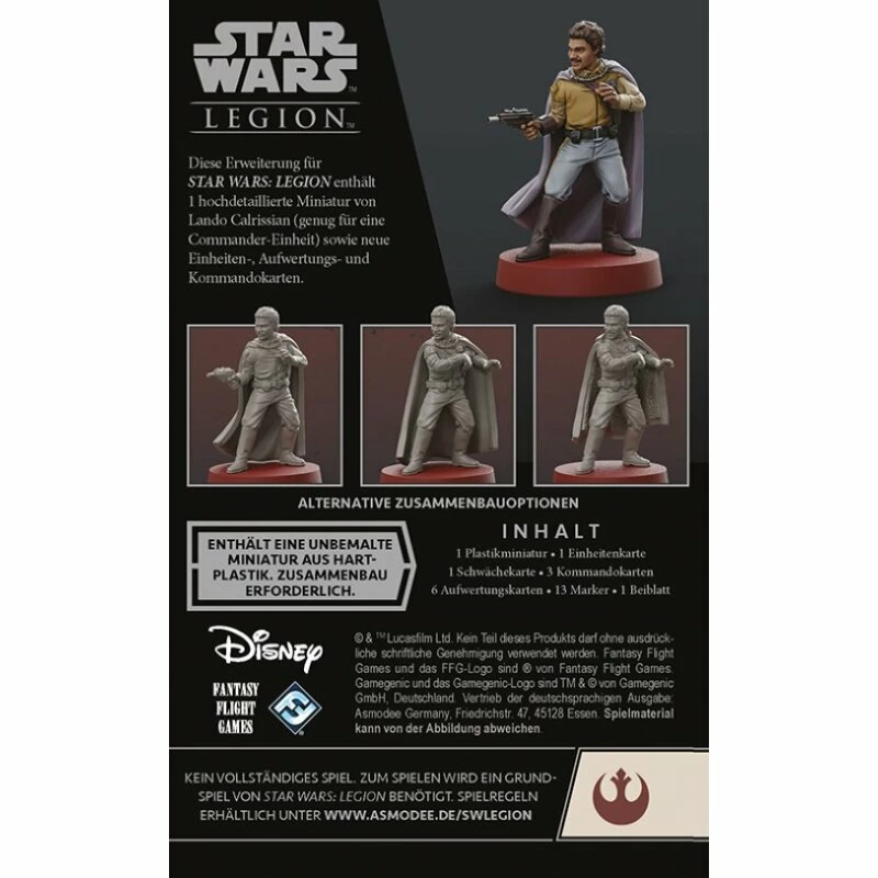 Diese Erweiterung enthält alles, was ein Spieler benötigt, um Lando Calrissian als Commander seiner Armee der Rebellenallianz einzusetzen, angefangen bei einer wunderschön modellierten, unbemalten Hartplastikminiatur, die Calrissians einzigartigen Sinn für Stil widerspiegelt. Es gibt drei verschiedene Optionen für seinen charakteristischen Umhang, man kann zwischen zwei Gesichtsausdrücken wählen und entscheiden, ob Calrissian nach seiner X-8 Nachtschütze Pistole im Holster greift oder sie bereithält.