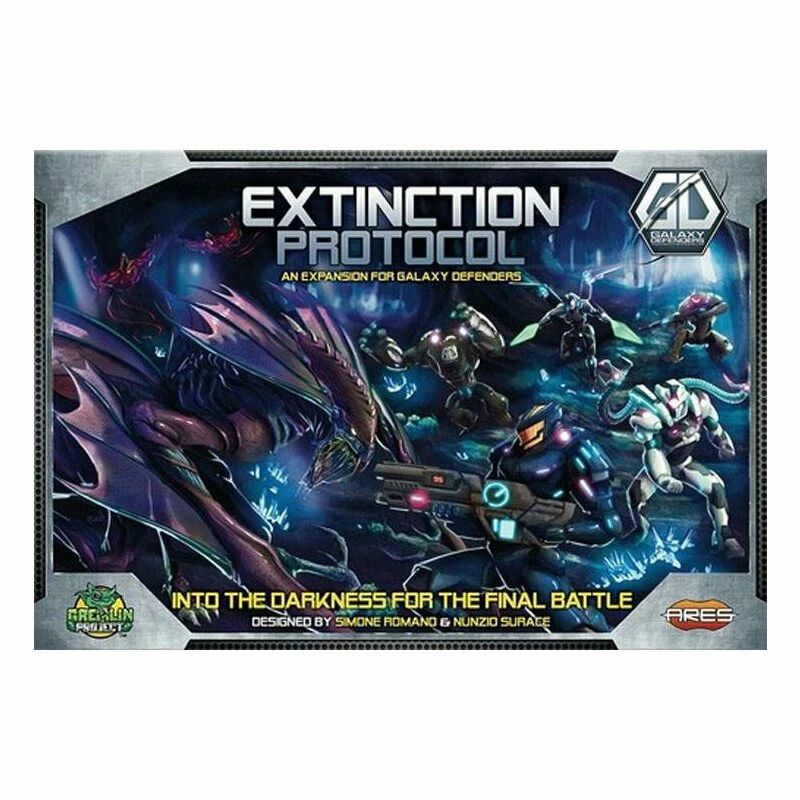 Extinction Protocol adds many new features and new mechanics, introducing new aliens and new characters. Master Aliens, the highest-ranked invaders in the Alien Army are present in this set, including the Kingator – a giant creature, half reptile and half war-drone – and the Alien Queen, a nearly invincible opponent that can poison his victims before she finishes them with her dreadful claws. The Agents can face these new enemies wearing lethal Power Armor, the ultimate mobile exoskeletons capable of imbuing the Agents with new unique powers and awesome firepower! Agents are no longer alone in this war, as Extinction Protocol introduces a Non-Player Character (NPC) system, allowing intelligent non-player agents to fight side by side with the GD squad. The underground of the alien planet is formed by endless narrow corridors and caves, represented by a new system of Modular Map Tiles, fully compatible with all previous maps of the game. The Extinction Protocol box includes new miniatures, new cards, new maps, a storybook and a new rulebook. This is not a complete product – A copy of Galaxy Defenders is required to play.