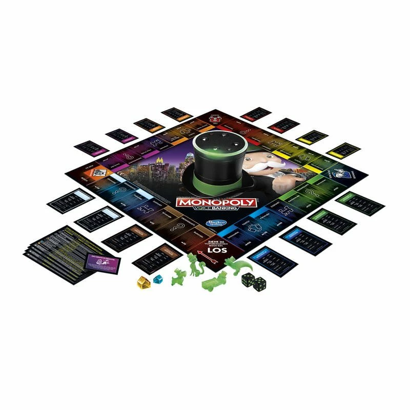Monopoly Voice Banking beeindruckt mit dem interaktiven Banking-Zylinder und dessen Lichtern und Sounds. Der Zylinder wickelt per Sprachsteuerung den kompletten Geldverkehr ab und Mr. Monopoly wird durch seine interaktiven Antworten lebendig. Er weiß stets die Kontostände aller Spieler, so dass sich keiner um Geldzahlungen oder Karten kümmern muss. Er antwortet auf Fragen und reagiert auf Befehle; sagen Sie zum Beispiel „Schlossallee kaufen”, führt er den Kauf selbstständig aus und das Spiel geht weiter.