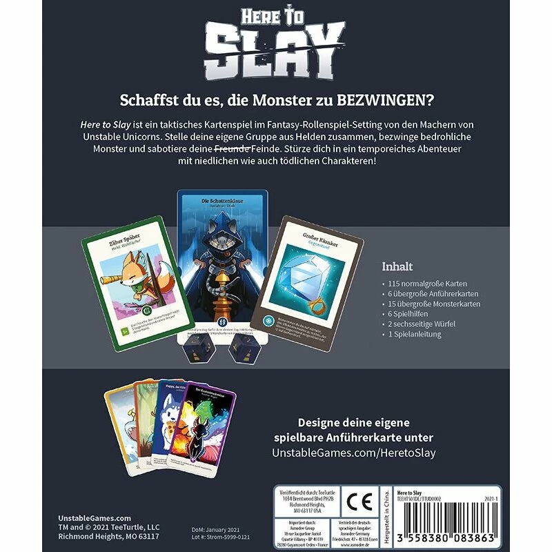 Here to Slay ist ein wettbewerbsfähiges Fantasy-Rollenspiel-Strategie-Kartenspiel, bei dem es darum geht, eine Gruppe von Helden zusammenzustellen und Monster zu erschlagen (und manchmal auch deine Freunde zu sabotieren), von den Machern von Unstable Unicorns.