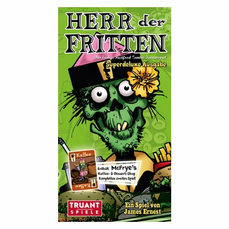Willkommen im Friedey’s, dem Fastfood-Restaurant der Verdammten rennen Zombies herum, um leckere Menüs zusammenzustellen. Du bist ein Zombie, der in einer Fastfood-Bude arbeitet. Und du hast nur eine Handvoll Zutaten zur Verfügung . Deine Aufgabe ist recht einfach: Erledige die Bestellungen schneller als jeder andere. Das ist zwar herausfordernd, aber nicht unmöglich. Besonders, wenn die Gäste ungeduldig werden und du eine Zutat weglassen darfst. Herr der Fritten ist ein schnelles, einfaches und lustiges Kartenspiel. Diese Box enthält zwei komplette Restaurantsets, das original Friedey’s und den neuen Kaffee und Dessert-Shop.