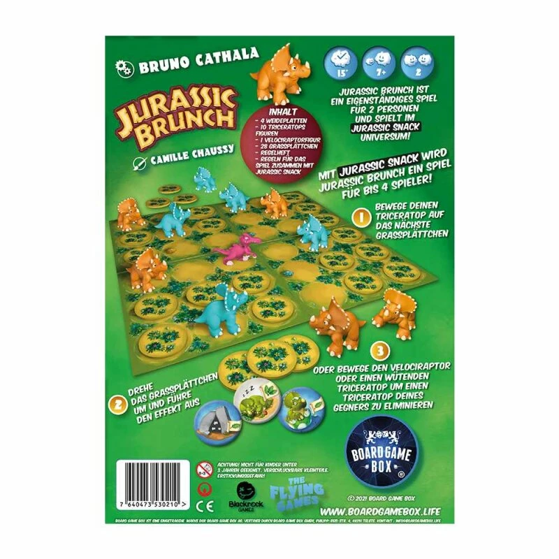 Mit Jurassic Brunch fressen sich Triceratops durch die Graslandschaft und sammeln Punkte. Jedoch müssen sie Acht geben auf den gierigen Velociraptor auf der Jagd nach den Triceratops.In einer grünen Landschaft steuern die Spieler ihre Triceratops über die Felder und sammeln Punkte und Spezialaktionen. Dabei können den bösen Velociraptor indirekt über die Aktionen gewisser Plättchen gesteuert werden. Die Triceratops haben zudem die Möglichkeit, andere Dinos zu rammen. Aber Achtung: wenn die Triceratops vergammeltes Gras fressen, legen sie sich schlafen. Das Spielfeld ist modular womit jedes Spiel mit einer neuen Ausgangslage startet.