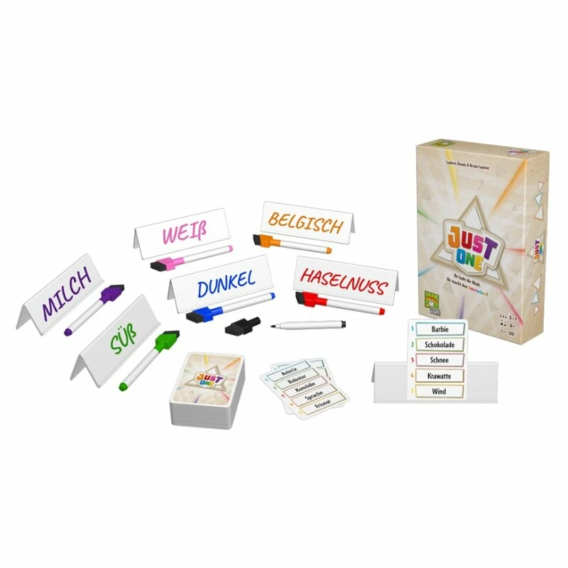 Just One ist ein kooperatives Partyspiel, bei dem alle zusammen gegen das Spiel spielen. Das Ziel ist es, gemeinsam möglichst viele der 13 geheimen Wörter zu erraten. In jeder Runde versucht einer als aktiver Spieler ein geheimes Wort zu erraten. Dabei helfen die anderen Spieler indem sie geheim und ohne sich abzusprechen je einen Hinweis auf ihre Tafeln schreiben.