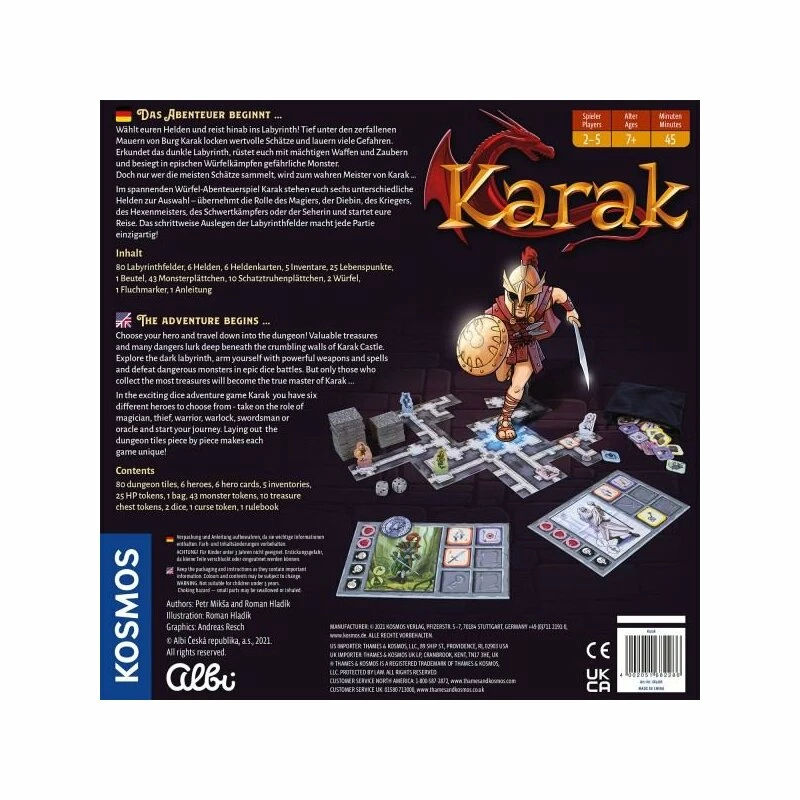 Welche Geheimnisse liegen tief unter den Ruinen von Burg Karak? Die Helden finden es heraus! Sie reisen hinab in das unterirdische Labyrinth. Um wertvolle Schätze zu bergen, nutzen sie ihre besonderen Fähigkeiten und stürzen sich in actionreiche Würfelkämpfe. Hinter jeder Ecke könnte das nächste Monster lauern! Stück für Stück entsteht so in jedem Spiel ein immer neues, einzigartiges Labyrinth. Wer überlistet seine Gegner, besiegt die Monster und gewinnt den Edelstein des Drachen? Das spannende Abenteuerspiel für Kinder ab 7 Jahren.