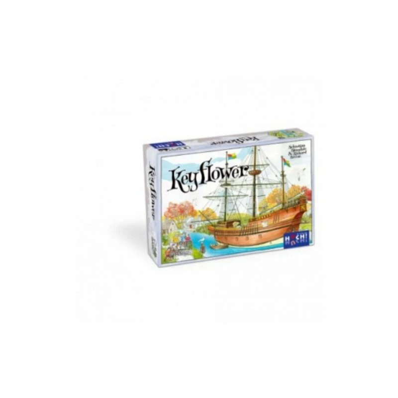 Keyflower is a game for two to six players played over four rounds. Each round represents a season: spring, summer, autumn and finally winter. Each player starts the game with a „home“ tile and an initial team of eight workers, each of which is colored red, yellow or blue. Workers of matching colors are used by the players to bid for tiles to add to their villages. Matching workers may alternatively be used to generate resources, skills, additional workers and victory points (VPs) not only from the player’s own tiles, but also from the tiles in the other players‘ villages and from the new tiles being auctioned. In spring, summer and autumn more workers will arrive on board the Keyflower and her sister boats, with some of these workers possessing skills in the working of the key resources of iron, stone and wood. In each of these seasons, village tiles are set out at random for auction. In the winter no new workers arrive and the players select the village tiles for auction from those they received at the beginning of the game. Each winter village tile offers VPs for certain combinations of resources, skills and workers. The player whose village and workers generate the most CPs wins the game.