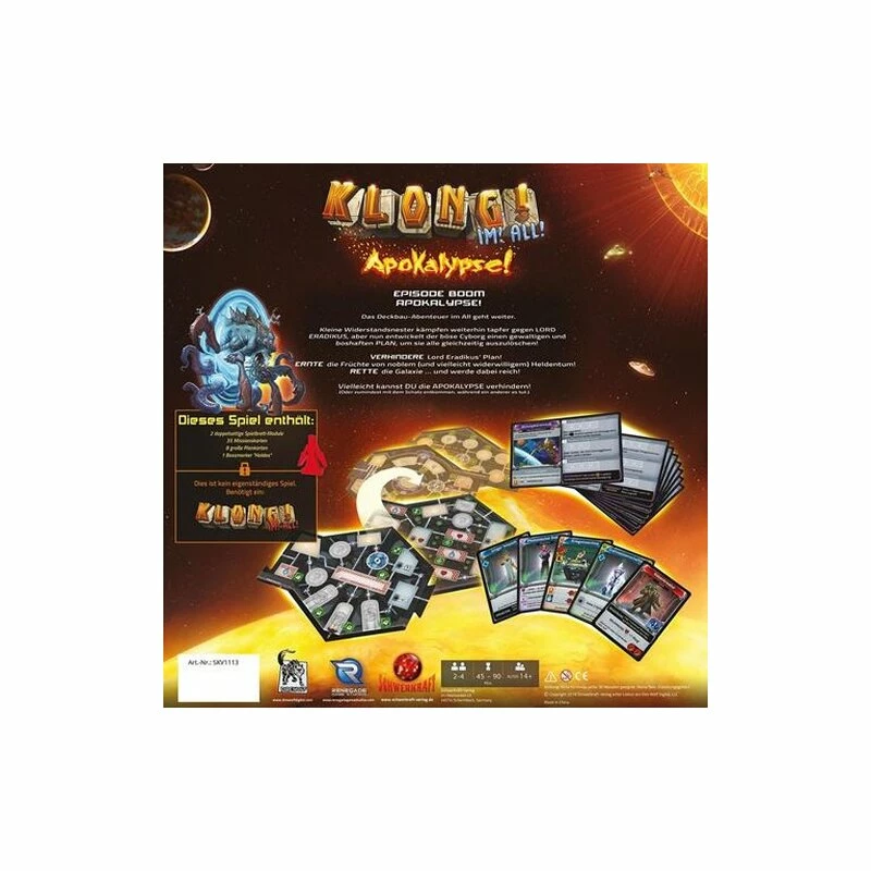 Klong! im! All!: Apokalypse erweitert das Grundspiel um neue Missionskarten, neue Spielbrett-Module sowie Plankarten. Für jede Partie wird ein Plan ausgewählt oder zufällig gezogen. Dieser bestimmt die Schwierigkeit des Spiels und gibt den Spielern neue Herausforderungen. Immer wenn ein schwarzer Bossstein aus dem Beutel gezogen wird, kommt dieser auf den Plan. Liegt eine bestimmte Anzahl Steine auf dem Plan, passieren schlimme Dinge. Gut, dass es immer möglich ist, Bosssteine vom Plan zu entfernen. Aber das kostet … und wer hat schon Zeit und Ressourcen übrig, wenn es gilt, Beute zu machen und nebenbei die Apokalypse zu verhindern.