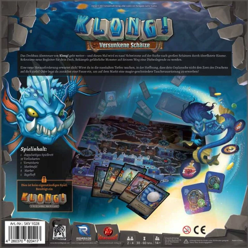 In KLONG! – Versunkene Schätze entdecken die Spieler zwei neue Verliese, die teilweise mit Wasser geflutet sind. Neben 35 neuen Verlieskarten kann nun auch eine Taucherglocke auf dem Markt gekauft werden. Der Goblin muss nicht länger alleine die Prügel beziehen, ein Goldfisch stellt sich mutig an seine Seite. Neue Regeln sorgen dafür, dass die Diebe in den Räumen, die unter Wasser stehen, regelmäßig Luft holen müssen.