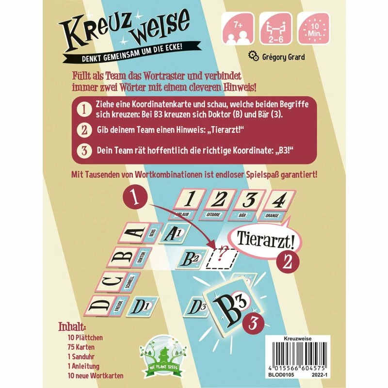 Kreuzweise ist die neue Version des kooperativen Partyspiels Cross Clues. Die Spieler arbeiten im Team zusammen, um das Wortraster mit Koordinatenkarten zu füllen. Sie müssen sich Hinweise für immer genau zwei Wörter im Raster ausdenken. Wenn die anderen erraten können, welche zwei Wörter gemeint sind, kommen sie dem Sieg ein Stück näher. Durch viele unterschiedliche Begriffe ergeben sich unzählige Möglichkeiten der Kombination und ein hoher Wiederspielwert.