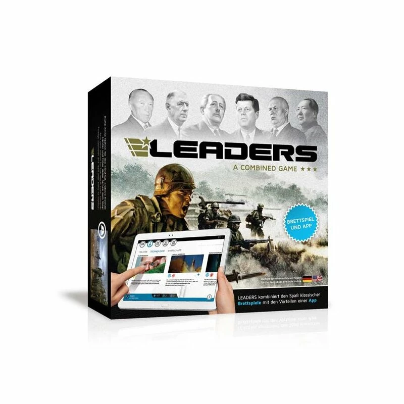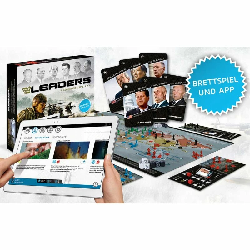 LEADERS BASISSPIEL – Dieses Strategiespiel versetzt bis zu sechs Spieler in die Ära des Kalten Krieges. Jeder Spieler versucht dabei die Weltherrschaft an sich zu reißen. Beweise diplomatisches Geschick und schmiede mächtige Allianzen. Erforsche bahnbrechende Technologien und sichere dir den entscheidenden Vorteil. Schicke Spione aus, um geheime Informationen über deine Mitspieler zu erfahren. Beteilige dich an Missionen der internationalen Staatengemeinschaft. Beweise militärische Stärke und erobere neue Gebiete. LEADERS ist ein innovatives hybrid Brettspiel, welches den Spaß klassischer Brettspiele mit den Möglichkeiten einer App kombiniert. Das Ergebnis ist ein völlig neues und bisher einzigartiges Spielerlebnis.