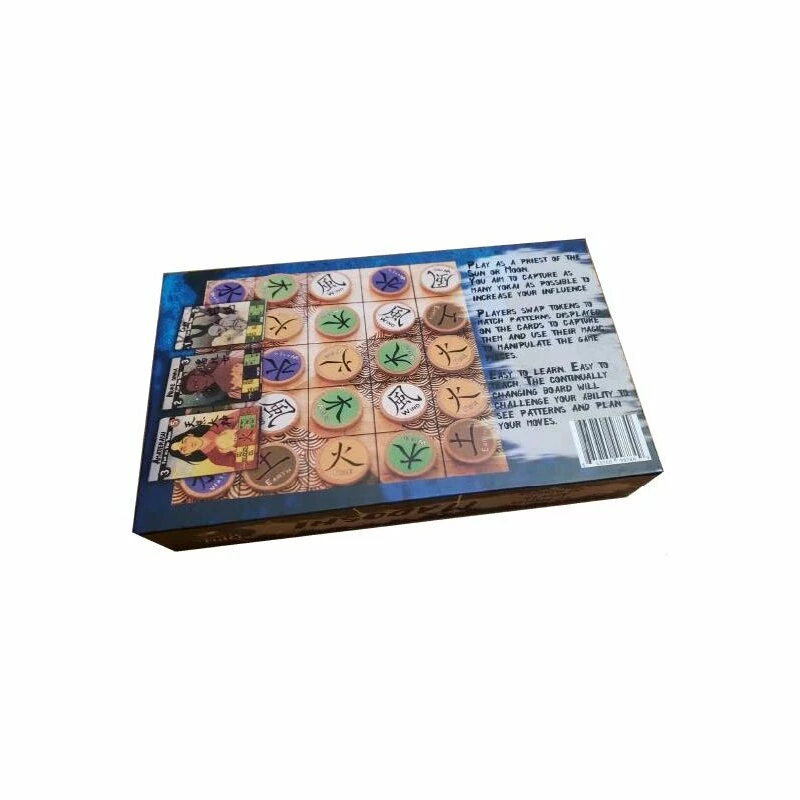 Madoshi: Priests of the Sun and Moon is a 1 or 2 player game where you will assume the role of priests of the Sun and the Moon taking turns to capture Yokai. Play occurs on a 5×5 grid with players swapping one token to create a pattern of elements matching that on the available Yokai cards. More power is gained with matches in the source element. After capture, there is a release of magical energy and the field of battle will change as a result. Voids are created, wild magic appears, or the universe could shift. Three levels of Yokai cards are placed next to the game board, and when one of the decks has been depleted, the game ends. The most points wins.