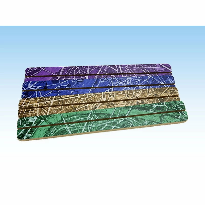 - Ein Set mit 4 Kartenhaltern aus Holz, die in den Farben des Spielers gedruckt sind. Jeder Kartenhalter kann bis zu 5 Spielkarten mit Ärmeln (58 x 88 mm) aufnehmen. Ein praktisches Gerät, mit dem Ihre Hände nachdenklich an Ihren Koteletten kratzen können, während Sie sich einen verschlagenen Plan ausdenken, um die Agenten der Gegner loszuwerden.