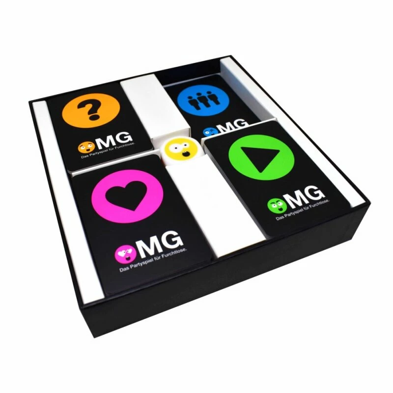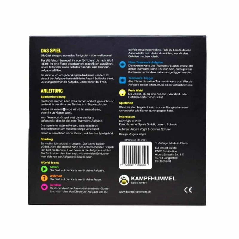 OMG ist ein ganz normales Partyspiel – aber viel besser! Per Würfelwurf besiegeln die Spieler ihr Schicksal: Je nach Wurf, „dürfen“ sie eine Frage beantworten, eine Aktion ausführen, einem Mitspieler einen Gefallen tun oder eine Gruppenaufgabe erfüllen.