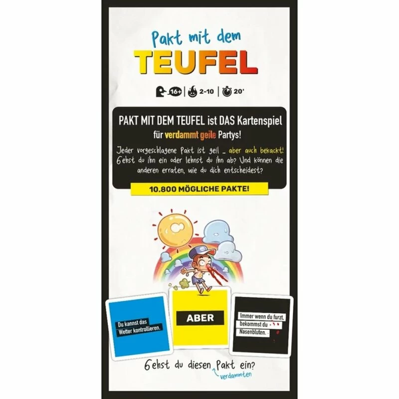 Pakt mit dem Teufel ist DAS Kartenspiel für verdammt geile Partys, bei dem die Spieler Punkte sammeln, indem sie erraten, wie sich die anderen bei einem aus drei Karten zusammengesetzten Pakt mit dem Teufel entscheiden würden. Hier wird es zu hitzigen Diskussionen und überraschenden Enthüllungen kommen, wenn die Spieler sich entscheiden müssen, ob sie sich auf Pakte wie diesen einlassen: Du kannst das Wetter kontrollieren, ABER immer, wenn du furzt, bekommst du Nasenbluten. Bei diesem verdammten Partyspiel ist jede Wahl eine Qual!