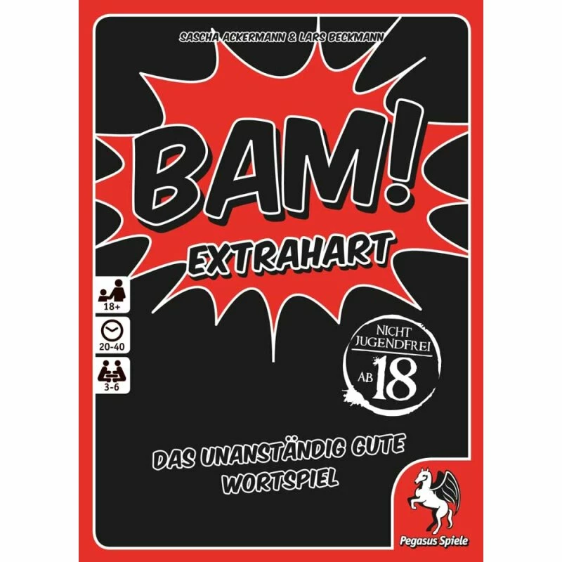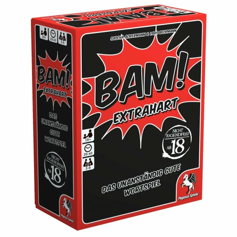 BAM! ist das freche Partyspiel, bei dem Schlag auf Schlag derbe bis geniale Wortspiele entstehen. Das beliebte Spielprinzip erschließt mit BAM! Extrahart neue Dimensionen der Unanständigkeit. Spieler ab 18 Jahren können hier als Grenzgänger des guten Geschmacks im Sekundentakt Tabus brechen. Eigenständig spielbar und mit BAM! kombinierbar. Nicht jugendfrei!
