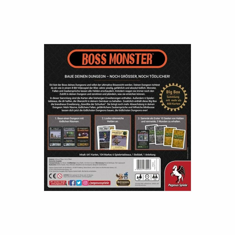 Die Boss Monster Big Box ist das ultimative All-in-One-Paket für Fans von Pixel Dungeons und schwarzem Humor. Es enthält zusätzlich zum Grundspiel die Erweiterungen Next Level, Bruchlandung, Werkzeuge nach Helden-Art, Aufstieg der Minibosse, Totale Zerstörung und Gewölbe der Schurken. Zudem sind sechs Dungeontableaus dabei, um die Kartenverliese angemessen in Szene zu setzen.