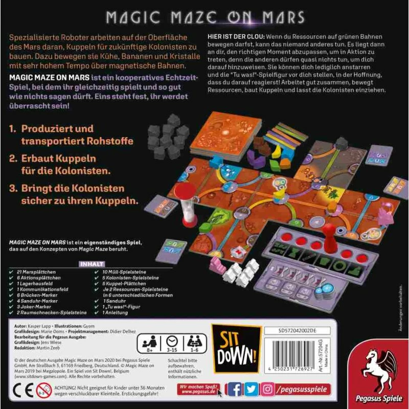 Spezialisierte Roboter arbeiten auf der Oberfläche des Mars daran, Kuppeln für zukünftige Kolonisten zu bauen. Dazu bewegen sie Vieh, Bananen und Kristalle mit sehr hohem Tempo über magnetische Bahnen. Wie in Magic Maze kann jeder Spieler dabei nur ganz bestimmte Aktionen durchführen, um die Roboter zu steuern und natürlich sind die Kommunikationssysteme die meiste Zeit außer Betrieb.