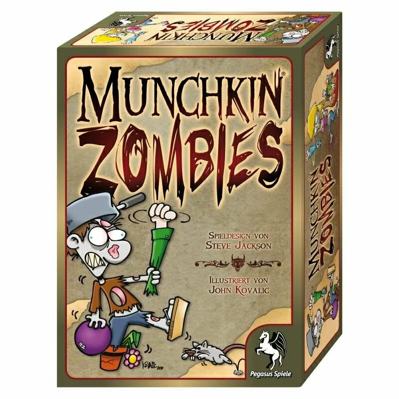 Töte die Lebenden! Friss ihre Gehirne! Gehiiiirrrrneee! Hier kommt das bislang krankeste und makaberste Munchkin-Setting! Ihr Munchkins seid nun Zombies, tretet Türen ein und fresst Gehirne. Die Monster, die ihr angreift, sind Menschen. Manche sind hilflos, manche brandgefährlich – und zusätzlich gibt es noch schurkische Zombies, die es zu besiegen gilt. Ihr habt Kräfte und Mojos. Rüstung und Waffen sind die Dinge, über die ihr während eurer torkelnden Suche nach Gehirnen stolpert. Also schnappt euch Mausefallen oder Topfpflanzen als Schuhwerk, und nehmt die Bowling-Kugel, denn da vorne kommt das Essen auf Rädern! Die neue Edition in der großen Doppelschachtel vereint erstmals Munchkin Zombies und Munchkin Zombies 2: Um Armeslänge voraus in einer Ausgabe.