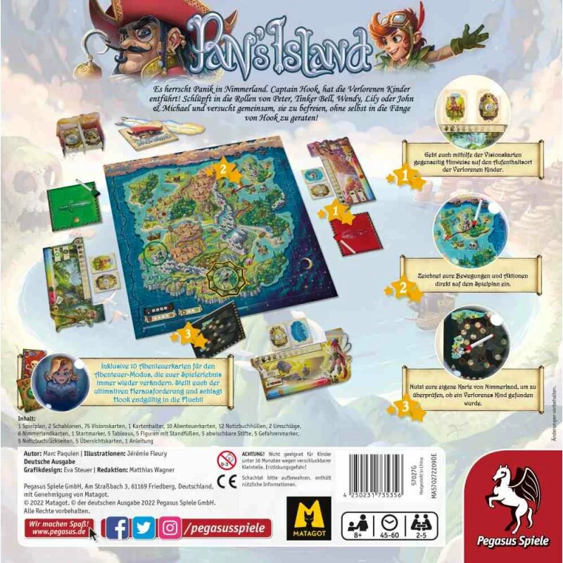 Obwohl alle Spielenden bei Pan’s Island ein Team bilden und auf ein gemeinsames Ziel hinarbeiten, haben sie nicht die gleichen Informationen: Jede*r kennt den Aufenthaltsort eines Kindes, kann diesen aber nicht verraten. Stattdessen erhält die Person zur Rechten verschlüsselte Hinweise, mit deren Hilfe sie das Kind selbst finden muss. In jeder Runde wählen die Spielenden dazu Visionskarten (Entferungs- oder Richtungsvisionskarten) und schätzen gleichzeitig die Gefahr durch Captain Hook ein, die sich aus den Hinweisen auf den Visionskarten ergeben könnte. Schließlich führen dann alle reihum einen Zug aus, in dem sie sich auf dem Spielplan bewegen, ein Lager aufschlagen und/oder nach den Verlorenen Kindern suchen können. All das findet dabei direkt auf dem folierten Spielplan mithilfe von Bewegungs- und Erkundungsschablonen statt. Ihre Bewegung markieren die Spielenden mithilfe abwischbarer Stifte und ihre Position durch eine eigene Figur. Ein Abenteuer-Modus sowie einzigartige Fähigkeiten der Held*innen sorgen für zusätzliche Herausforderungen.