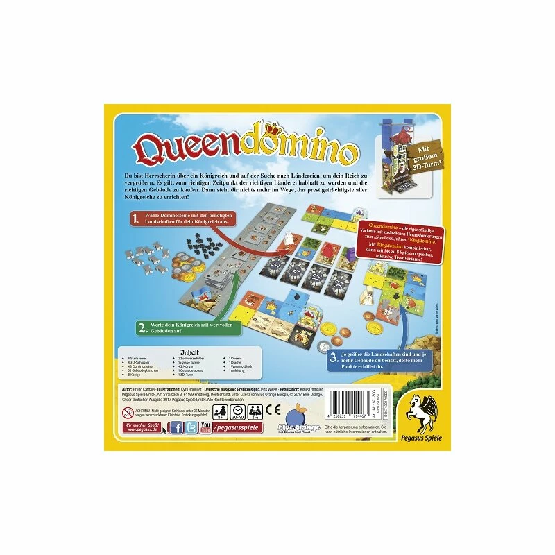 In Queendomino bist du Herrscherin über ein Königreich und auf der Suche nach Ländereien, um dein Königreich zu vergrößern. Es gilt, zum richtigen Zeitpunkt der richtigen Länderei habhaft zu werden und die richtigen Gebäude zu kaufen. Dann steht dir nichts mehr im Wege, das prestigeträchtigste aller Königreiche zu errichten!