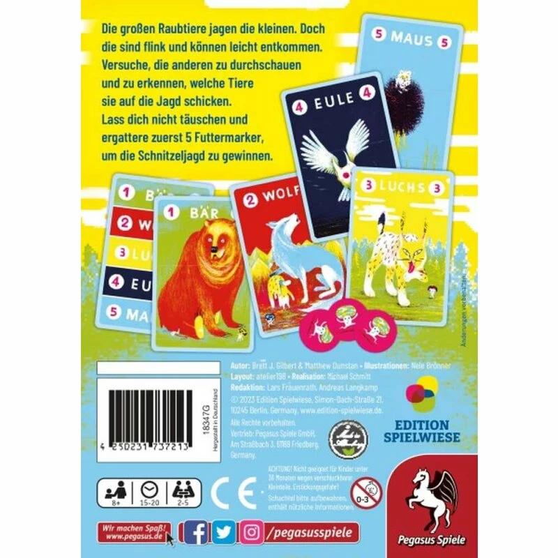 In dem Kartenspiel Schnitzeljagd gehen die Spielenden als Waldtiere auf die Jagd. In jeder Runde müssen sie geheim entscheiden, welches der Tiere auf ihrer Hand – Bär, Wolf, Luchs, Eule oder Maus – sie ausspielen. Beginnend mit dem Bären werden dann nach und nach alle Tiere aufgerufen und jagen je ein schwächeres Beutetier. Wer das genannte Tier verdeckt vor sich liegen hat, muss es nun aufdecken und scheidet aus dem Durchgang aus. Alle anderen spielen mit den verbleibenden Karten solange weiter bis nur noch eine Person übrig ist oder die dritte Jagd endet. Wer die anderen Mitspielenden richtig einschätzt und zum richtigen Zeitpunkt die richtigen Tiere ausspielt, erhält wertvolle Futtermarker und kommt dem Sieg ein Stückchen näher.