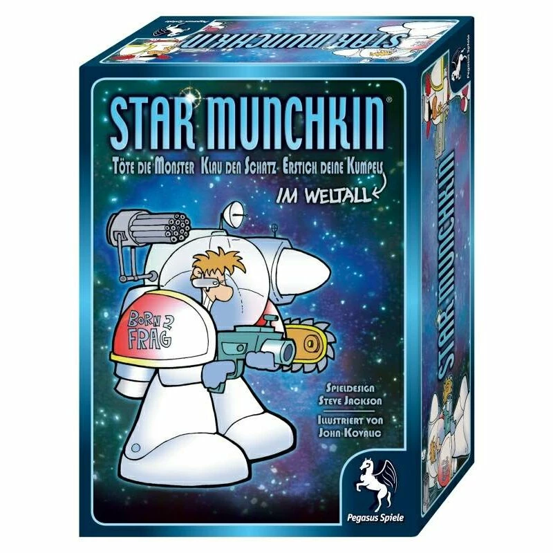Die Munchkins sind wieder da – diesmal greifen sie nach den Sternen! Sie sind nun Mutanten, Cyborgs, Kopfgeldjäger und Katzenmenschen. In diesem selbständigen Basispiel für Munchkin wird jeder aus dem Lachen nicht mehr herauskommen, der Weltraumsagas wie Star Wars und Star Trek liebt. Und wie immer gewinnt, wer als Erster die zehnte Stufe erreicht.