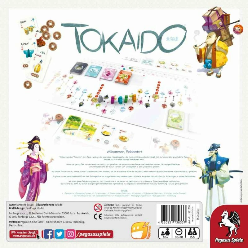 Willkommen bei Tokaido, dem Spiel rund um die legendäre Handelsstraße, die Kyoto mit Edo verbindet. Die Spieler begeben sich auf eine außergewöhnliche Reise, bei der sie zahlreiche Wunder entdecken, die erholsame Ruhe der heißen Quellen genießen, kulinarische Köstlichkeiten kennenlernen und noch viel mehr. Dabei gilt es, durch gute Zeitplanung den Überblick nicht zu verlieren, um methodisch und voll innerer Ruhe die eigene Reise fortzusetzen. So riskieren die Spieler nicht, auf dieser einzigartigen Handelsstraße irgendetwas zu verpassen, und können die Tokaido-Erfahrung voll und ganz genießen!