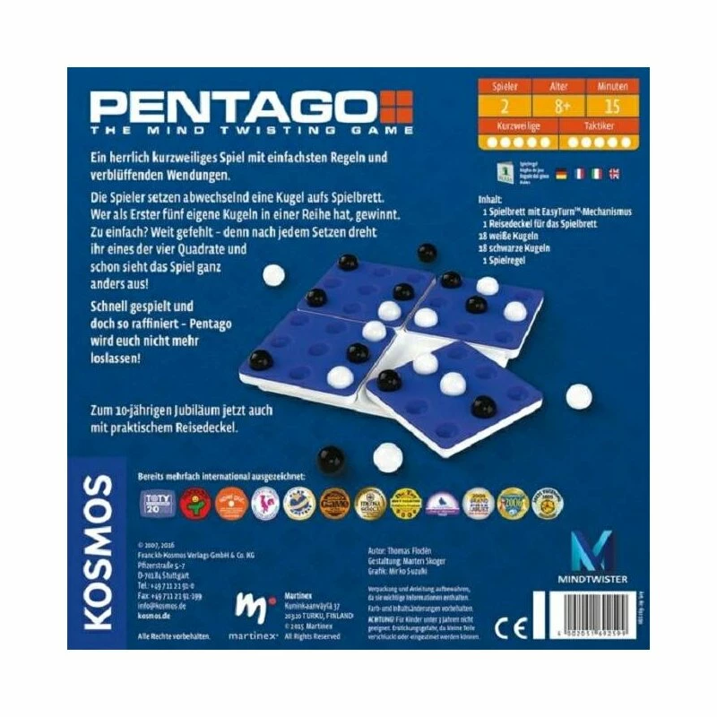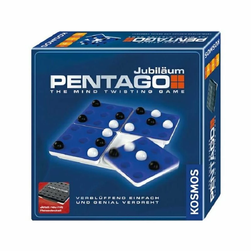 Ein herrlich kurzweiliges Spiel mit einfachsten Regeln und verblüffenden Wendungen. Die Spieler setzen abwechselnd eine Kugel aufs Spielbrett. Wer als erster fünf eigene Kugeln in einer Reihe hat, gewinnt. Zu einfach? Weit gefehlt, denn nach jedem Setzen dreht der Spieler eines der vier Quadrate und schon sieht das Spiel ganz anders aus.