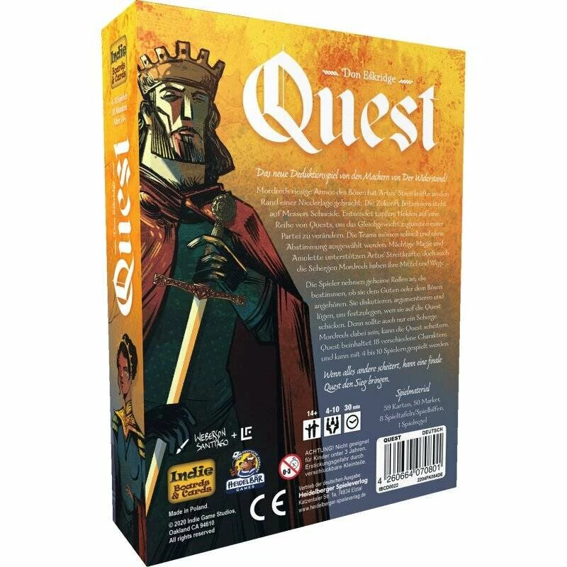Die Spieler nehmen geheime Rollen an, die bestimmen, ob sie dem Guten oder dem Bösen angehören. Sie diskutieren, argumentieren, und lügen, um festzulegen, wen sie auf die Quest schicken. Denn sollte auch nur ein Scherge Mordreds dabei sein, kann die Quest scheitern. Quest beinhaltet 18 verschiedene Charaktere und kann mit 4 bis 10 Spielern gespielt werden.