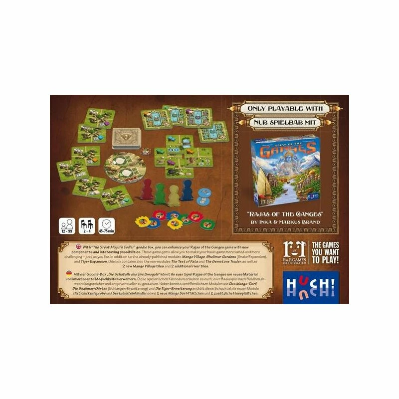 In der Schatulle des Großmoguls finden sich diverse Mini-Erweiterungen bzw. Module, mit denen das Basisspiel Rajas of the Ganges bereichert und variiert werden kann. Die Schatulle enthält 3 zuvor im Rahmen des Brettspieladventskalenders und der Deutscher-Spielpreis-Goodie-Box in Kleinauflage publizierte Ganges-Module: Das Mango-Dorf, die Tiger-Erweiterung und die Shalimar-Gärten (Schlangen-Erweiterung). Zusätzlich stehen die Module Die Schicksalsprobe und Der Edelsteinhändler zur Verfügung sowie je 2 neue Plättchen für das Mango-Dorf und den Fluss.