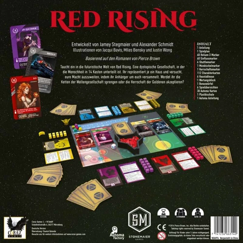 Die Menschheit hat das Sonnensystem kolonisiert, ganze Planeten terraformt und die Gesellschaft in 14 Kasten unterteilt. Oben, an der Spitze regieren die Goldenen, die mächtigsten Personen der Weltengesellschaft. Die unterste, rote Kaste ist die Kaste der einfachen Arbeiter, die heute noch Helium-3 auf dem Mars abbauen.Widerstand wird in der strengen Gesellschaftsordnung nicht geduldet. Die Goldenen widmen sich stattdessen im Institut auf dem Planeten Mars der Ausbildung neuer Führungspersönlichkeiten. Diese sollen Macht und Privilegien der goldenen Kaste erhalten und weiter ausbauen.Ihr repräsentiert in Red Rising je ein Haus und versucht euren Einfluss auszuweiten, indem ihr Anhänger um euch versammelt. Werdet ihr die Herrschaft der Goldenen akzeptieren oder organisiert ihr euch im Untergrund, um die Ketten der Weltengesellschaft zu sprengen?