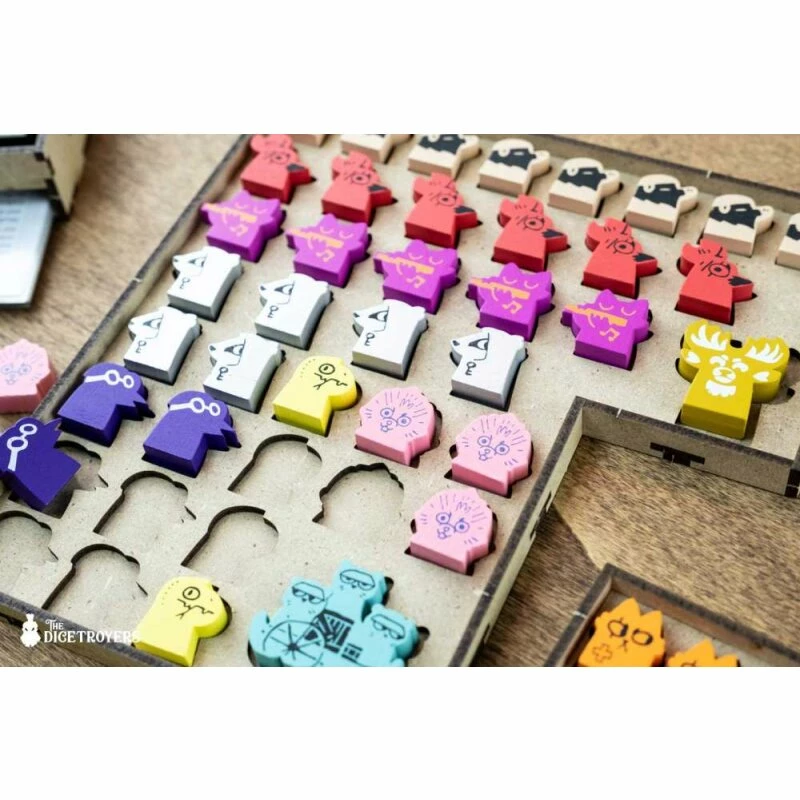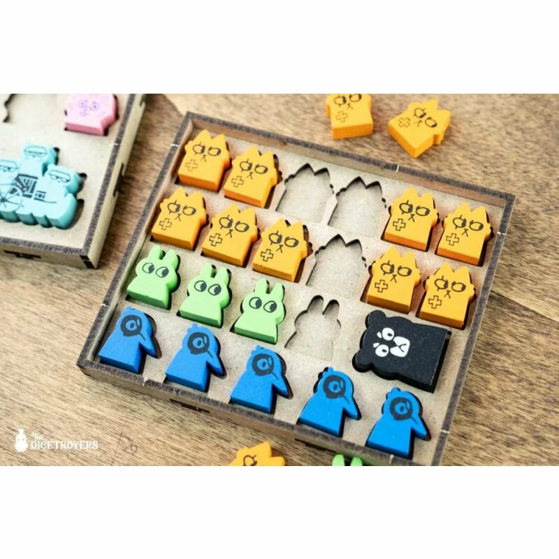 - -2x Ablagen für Mietlinge und zusätzliche Meeples, mit geformten Schlitzen;
