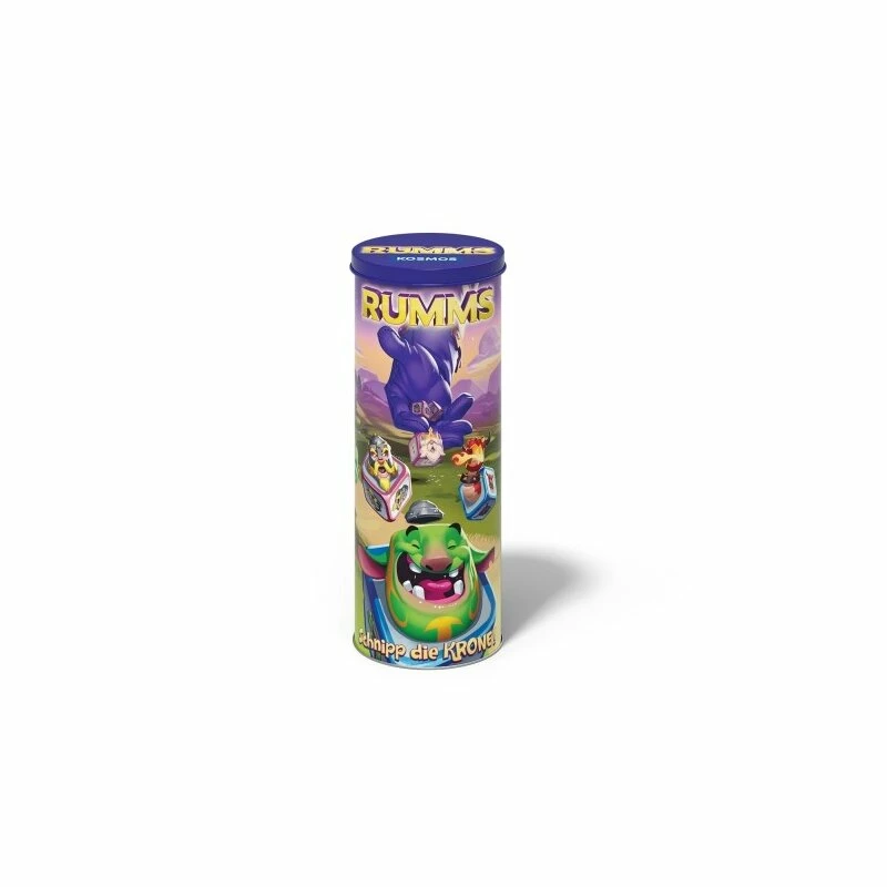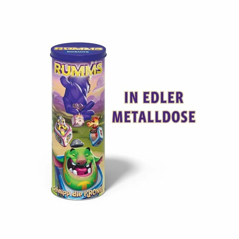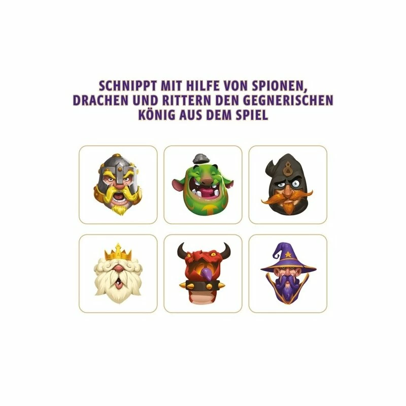 Schnippen fürs Königreich! In einem spannenden Zweikampf um die Krone tritt das blaue gegen das rote Königreich an. Dabei wird jedes Team von einer starken Truppe unterstützt. Während Ritter und Spione den Spielern beim Angriff helfen, verteidigen Trolle und Drachen ihren König rund um die eigene Ritterburg. Welche Formation ist wohl die beste, um den Gegner zu besiegen? Dank einfacher Regeln legen Spieler ab 7 Jahren sofort los. Sie schnippen und versuchen, die gegnerischen Würfel von der Matte zu befördern. Gewonnen hat, wer den König des anderen Teams zuerst von der Spielmatte schnippt. Ein Muss für alle Würfel-Fans! Das actionreiche Familienspiel in der Metalldose.