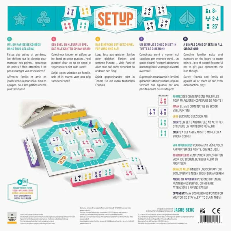 Intuitiv, schnell gelernt und knifflig zugleich – das ist das Legespiel SetUp. Die Spieler bilden Sets oder Reihen auf dem Spielplan, indem sie Steine von ihrer Bank oder aus der Auslage auf das Spielbrett legen: entweder auf freie Felder oder auf bereits ausliegende Steine. So verändern die Spieler beständig die Optionen und sammeln Punkte.