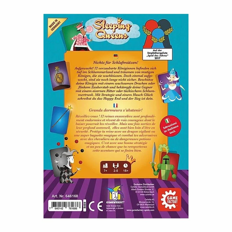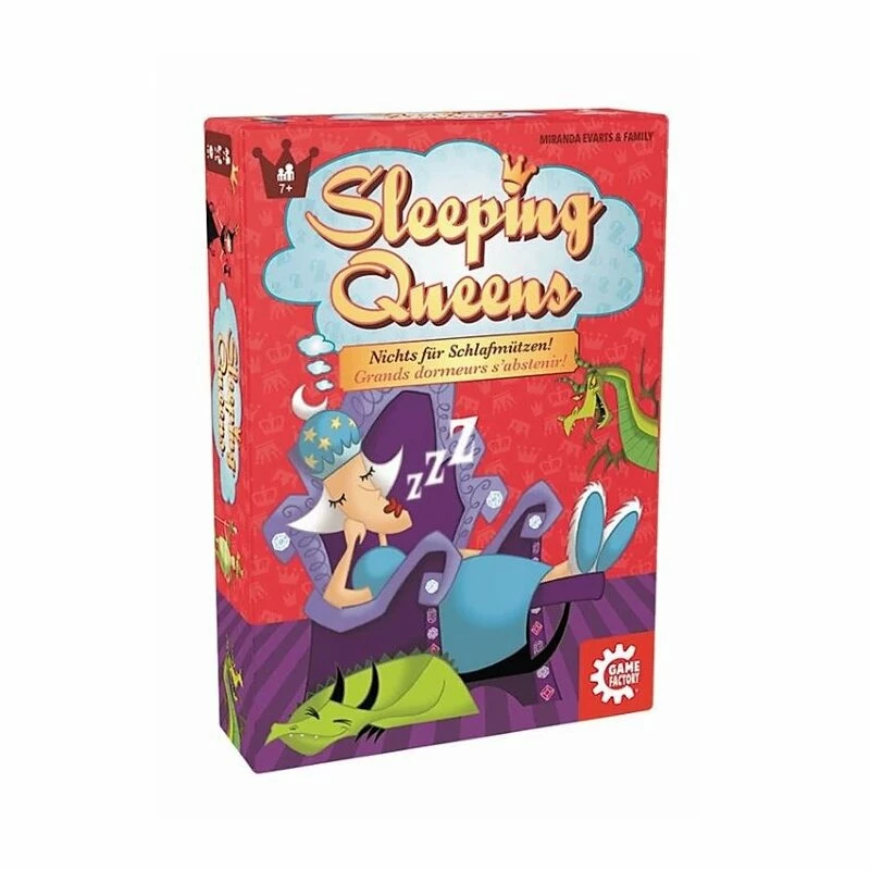 Aufgewacht! 12 verzauberte Königinnen befinden sich tief im Schlummerland und träumen von mutigen Königen, die sie wach küssen. Doch einmal aufgeweckt, sind sie noch lange nicht sicher. Beschütze deine Königin mit einem wachsamen Drachen oder flinkem Zauberstab und bekämpfe deine Gegner mit einem eisernen Ritter oder tückischem Schlummertrunk. Mit Strategie und einem Hauch Glück schreibst du das Happy End und der Sieg ist dein. Doch Vorsicht: Mit dem Hofnarr ist nicht immer zu spaßen, denn sehr schnell hat er die Geschichte neu erzählt. Sleeping Queens ist ein märchenhaftes Abenteuer mit fabelhaften Figuren, für große und kleine Könige.
