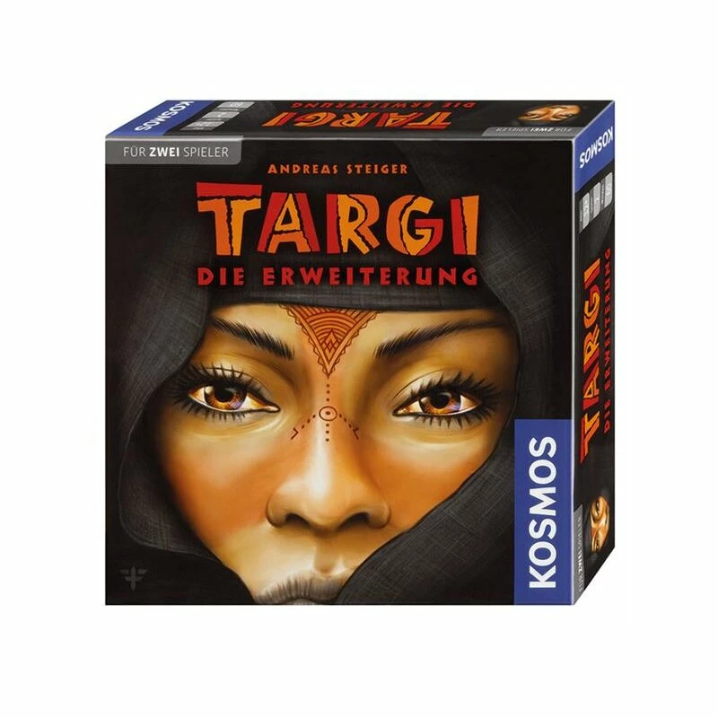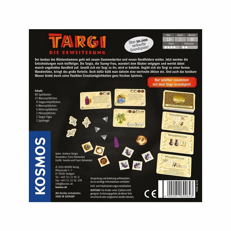 Der Stammesbau geht weiter in Targi: Die Erweiterung. Mit Wasser als neuem Element wird der Ausbau des Stammes flexibler. Einen Targi auf eine Wanderdüne zu schicken, kann im richtigen Moment von Vorteil sein. Und wer die Nähe zur Tuareg-Frau, der Targia, sucht, wird belohnt. Die Erweiterung ist nur spielbar mit dem Grundspiel!