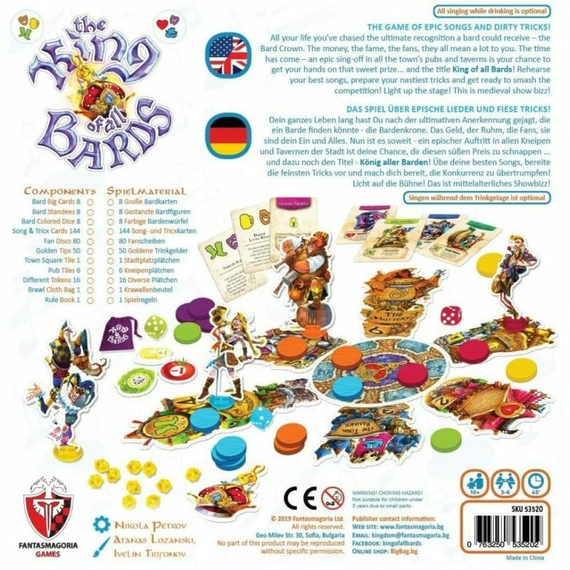 Das Spiel über epische Lieder und fiese Tricks! Dein ganzes Leben lang hast Du nach der ultimativen Anerkennung gejagt, die ein Barde erhalten könnte – die Bardenkrone. Das Geld, der Ruhm, die Fans, sie sind dein Ein und Alles. Nun ist es soweit – ein epischer Auftritt in allen Kneipen und Tavernen der Stadt ist deine Chance, dir diesen süßen Preis zu schnappen … und dazu noch den Titel – König aller Barden! Übe deine besten Songs, bereite die feinsten Tricks vor und mach dich bereit, die Konkurrenz zu zerschmettern! Licht an, Bühne frei! Das ist großes Showbizz im Mittelalter!