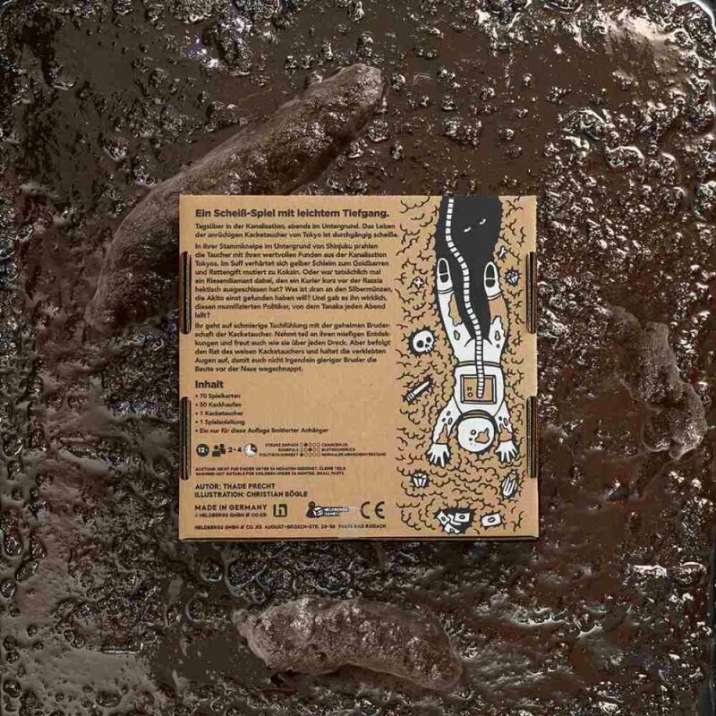Zwei bis vier Spieler gehen auf schmierige Tuchfühlung mit der geheimen Bruderschaft der Kacketaucher. Nehmt teil an ihren miefigen Entdeckungen und freut euch wie sie über jeden Dreck. In dieser Welt haben alle Fundstücke denselben Wert. Aber befolgt den Rat des weisen Kacketauchers und haltet die verklebten Augen auf, damit euch nicht irgendein gieriges Arschloch die Beute vor der Nase wegschnappt.